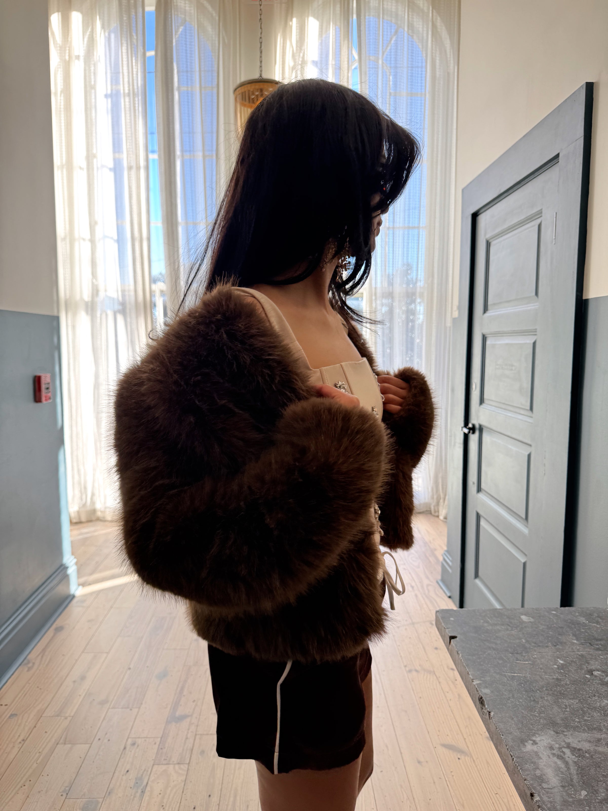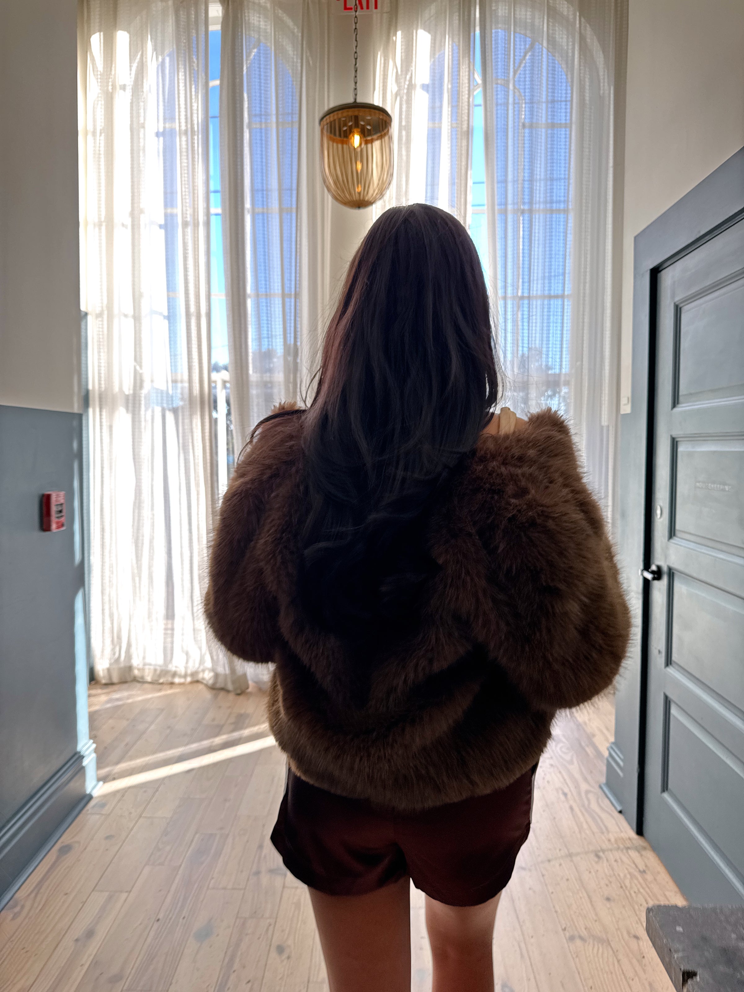 Elevate your look with this luxurious faux fur cropped jacket. Designed in a timeless black hue, this piece features a soft, plush texture that adds instant sophistication to any outfit.
