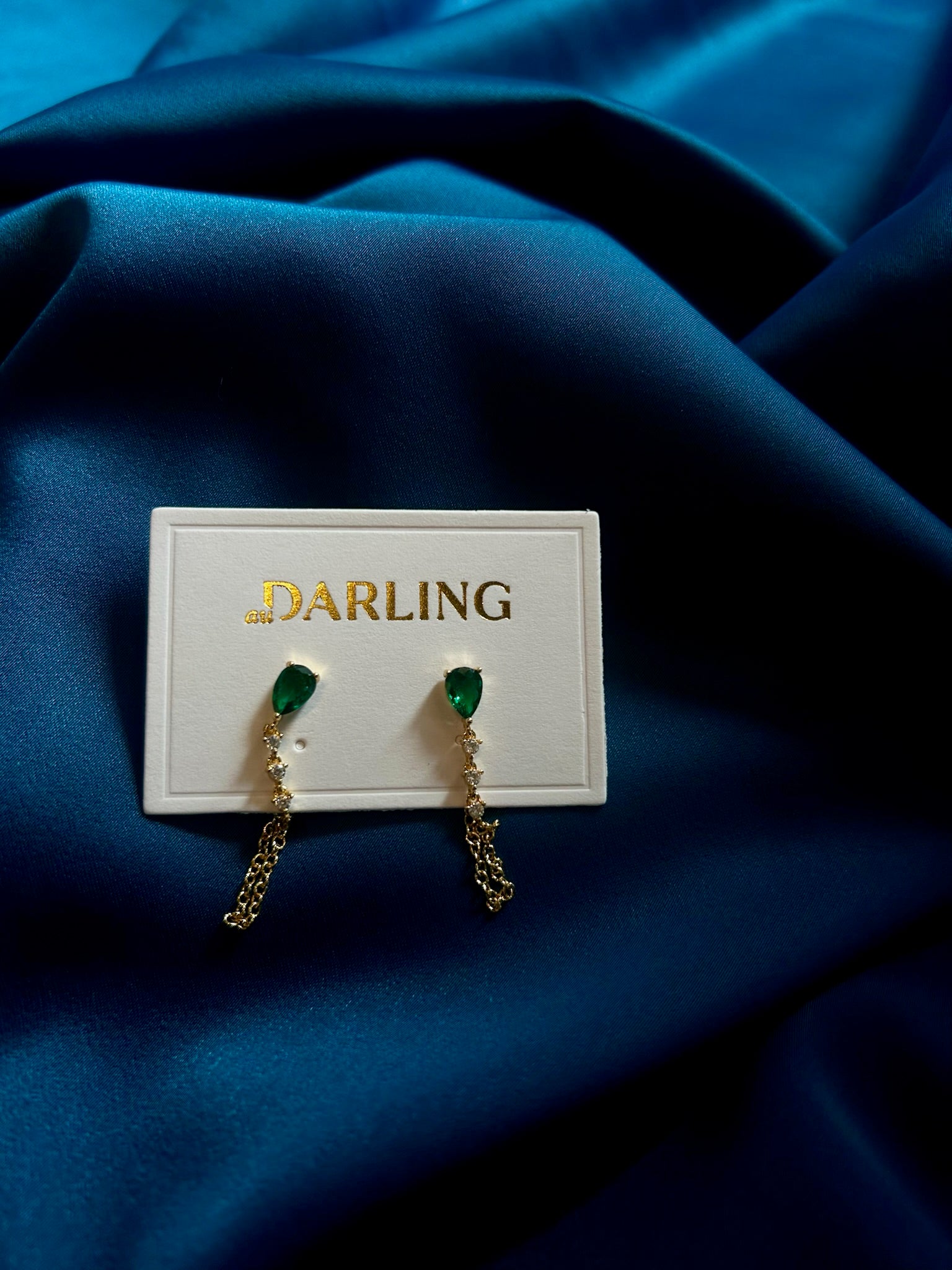Dainty teardrop emerald stone with gold chain earrings on a stud
