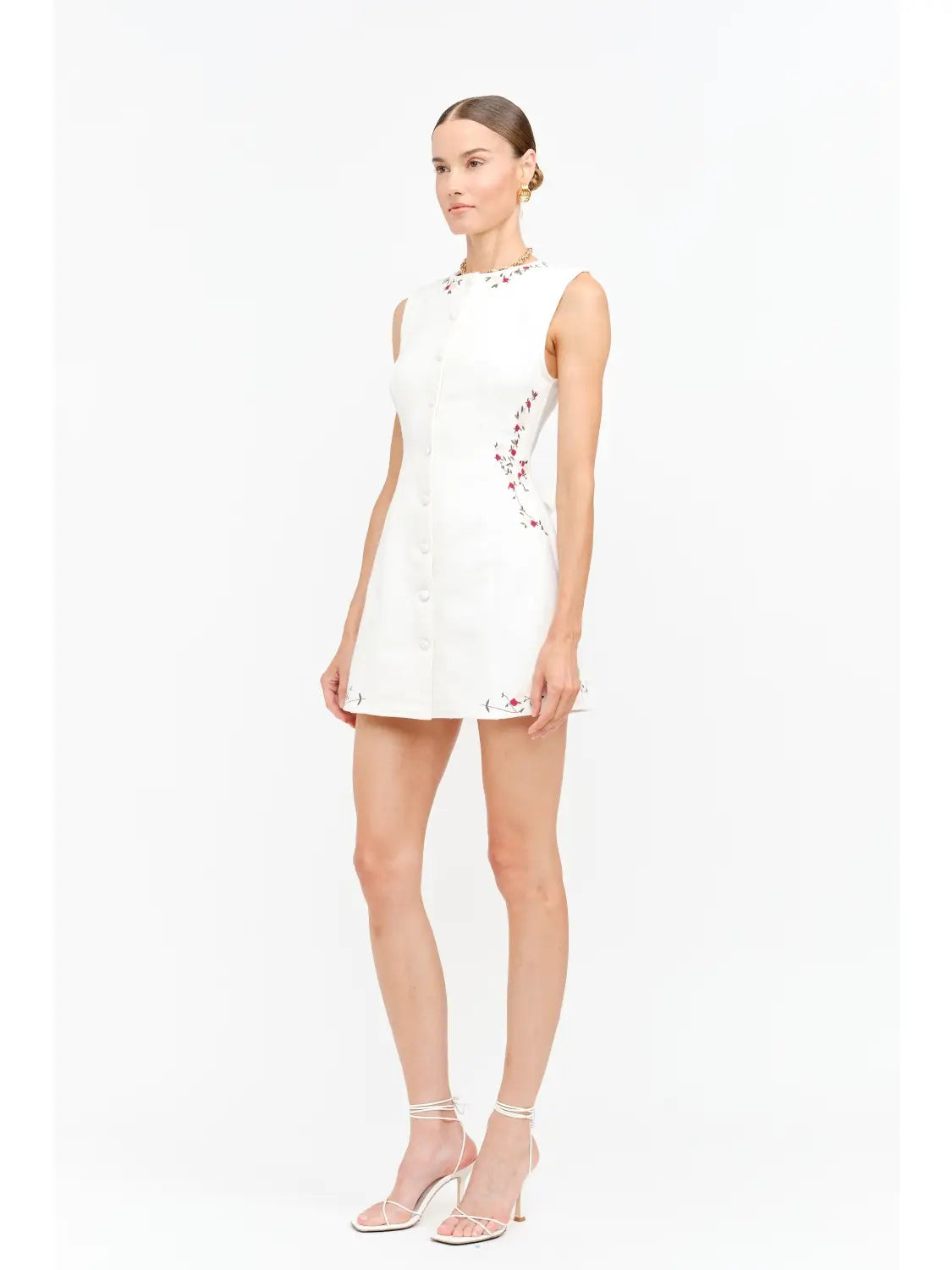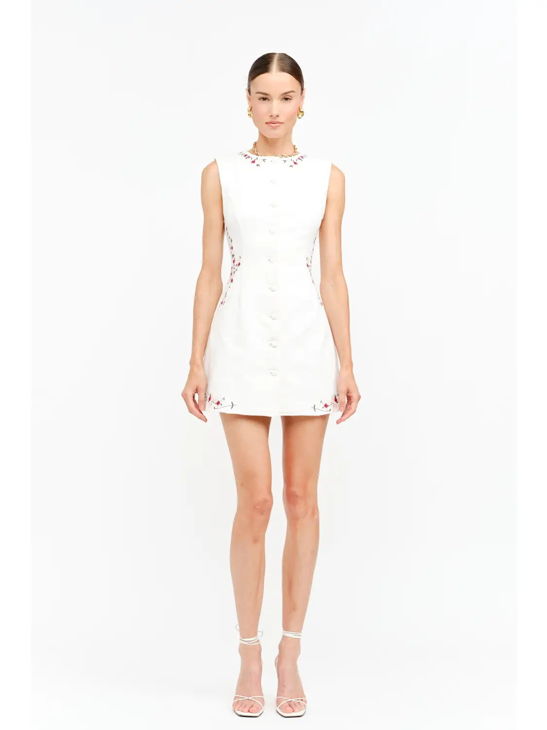 A charming mini dress with delicate floral embroidery and feminine detailing. Featuring a clean sleeveless silhouette, covered button front, and a waist tie at the back for a flattering finish.