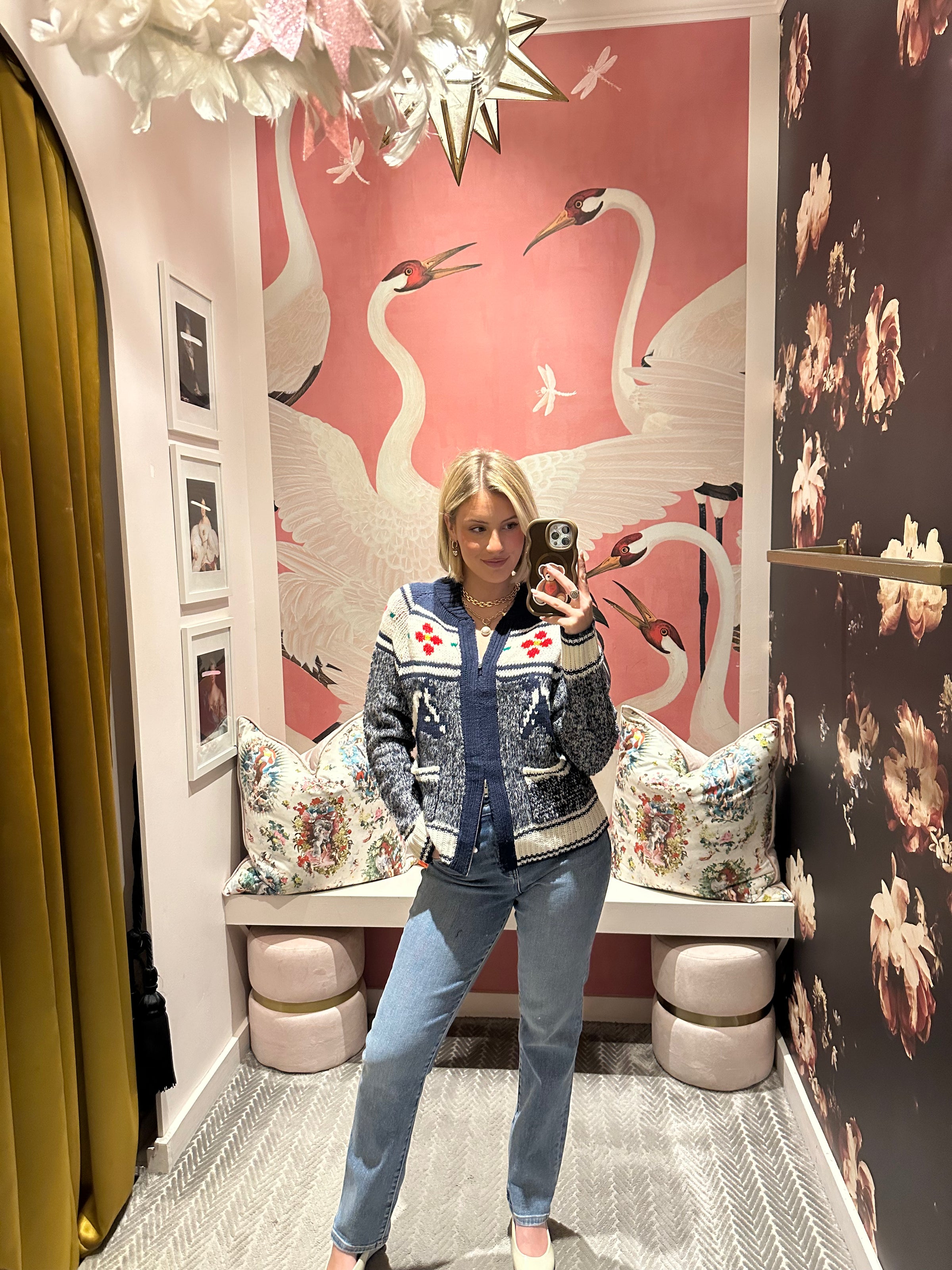 - Navy & cream sweater with floral & horse print