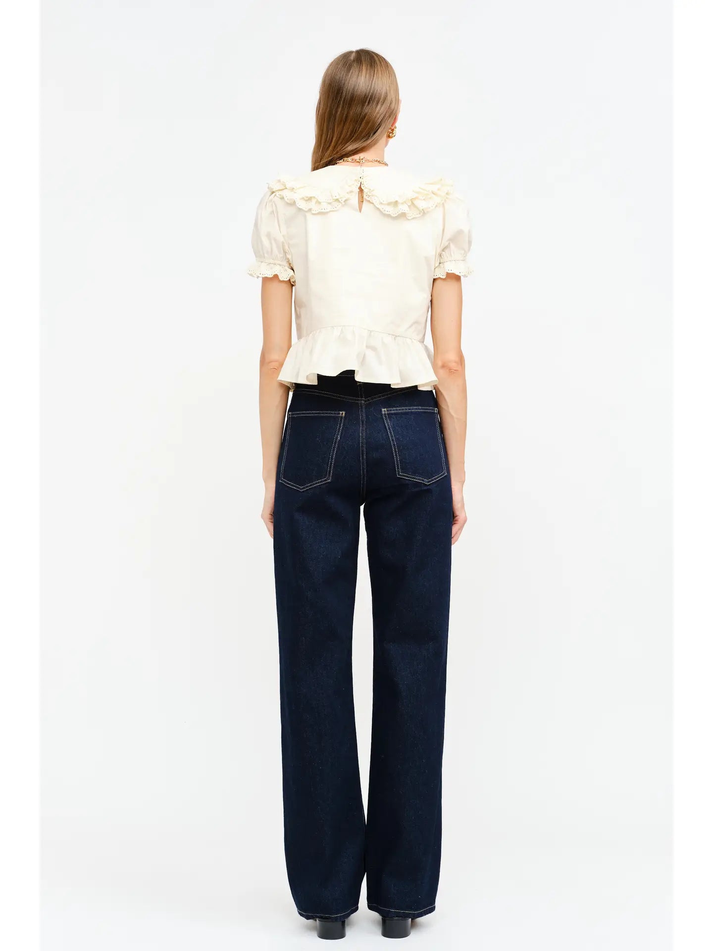- Sweet with a hint of drama, this ruffled peplum top blends vintage structure with playful volume. Designed with cascading ruffles down the front and at the collar, it features puffed short sleeves, a gathered hemline, and dainty trim for added charm.