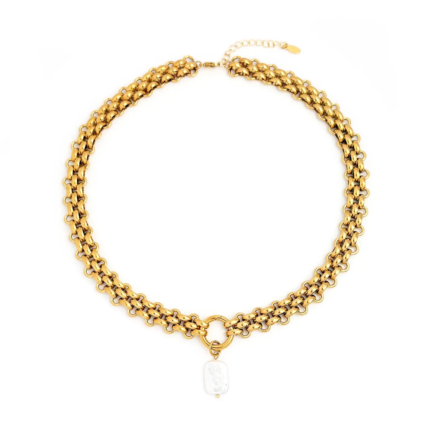 A bold statement chain with a smooth gold finish designed to stand out. The centerpiece features a freshwater pearl drop in a natural rectangular form that adds a soft elegant touch to the chunky layered look. Each pearl has unique shape and natural texture which gives every necklace its own character. Water resistant stainless steel for everyday wear with a polished high end feel.
