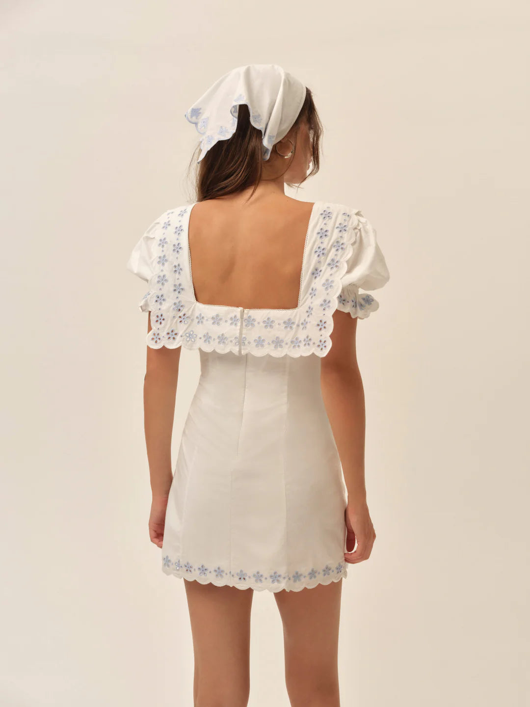 Clean lines meet romantic detail in this white poplin mini dress, where a fitted silhouette, puff sleeves, and an embroidered collar feel equally at home seaside or strolling cobblestone streets.