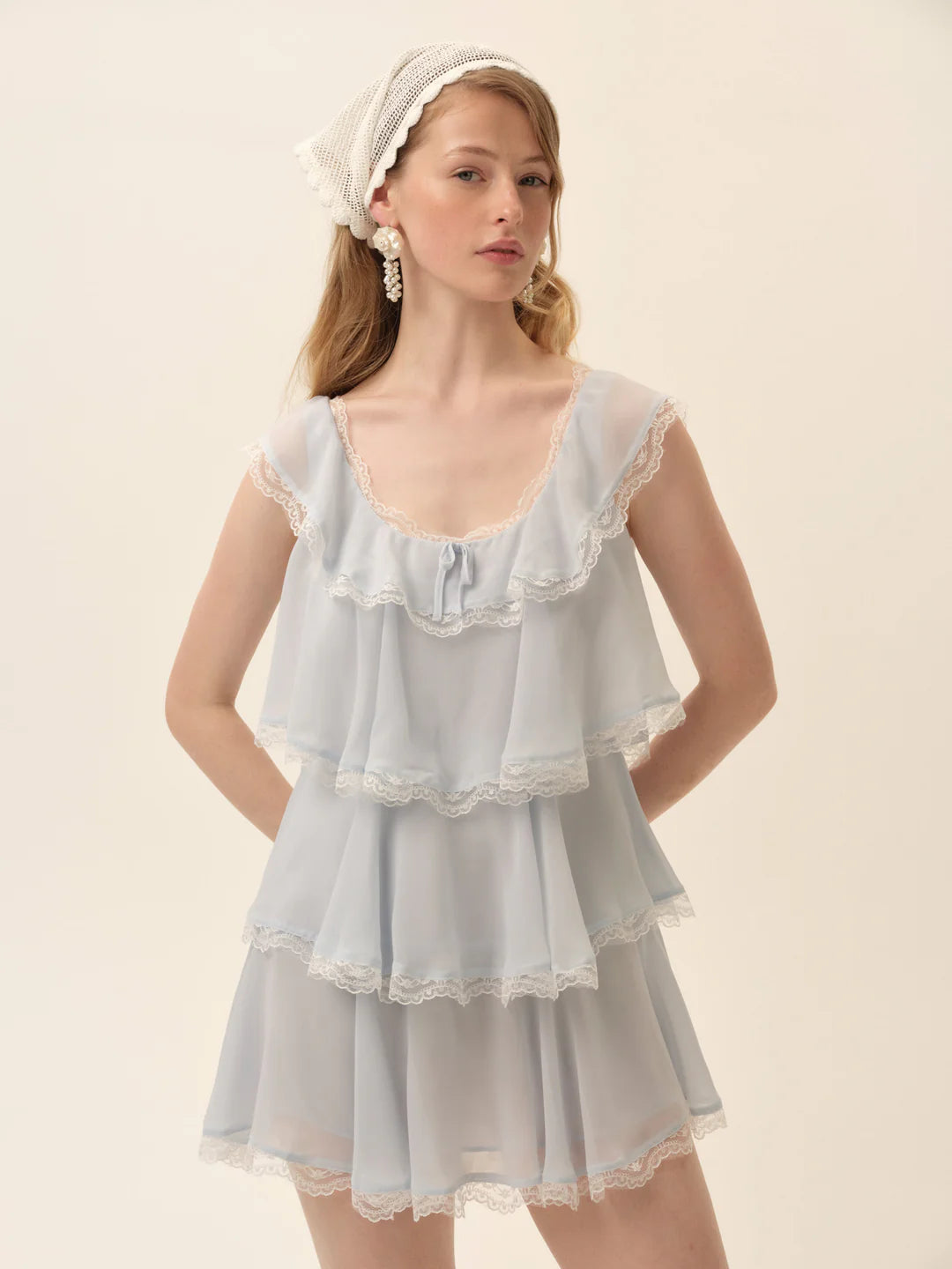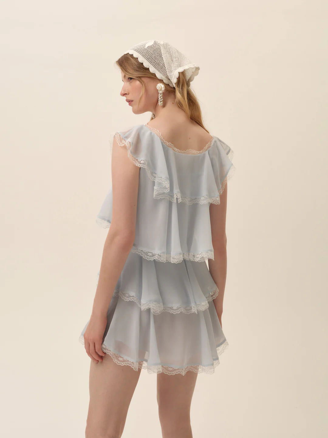 A powder blue chiffon mini dress with tiered ruffles, lace trims, and a scooped neckline give this spring mini dress a flouncy, feminine flourish.