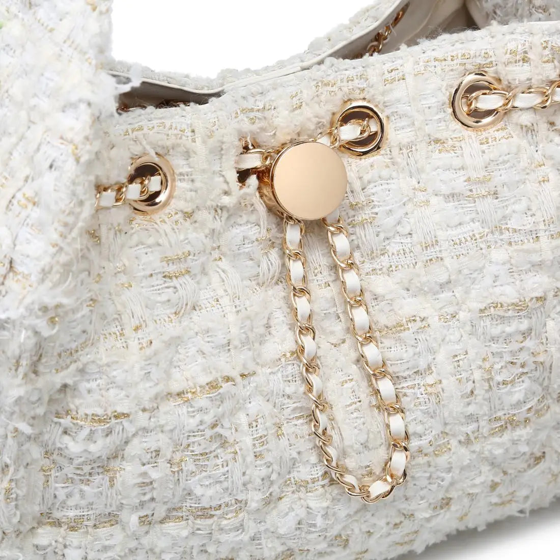 • Bouclé tweed hobo, Shoulder Bag with chic chain‑woven strap. Soft textured tweed body, statement chain strap and secure drawstring with round medallion. Roomy interior, internal pockets and side flap details for organization, vegan-friendly materials for ethically minded shoppers.