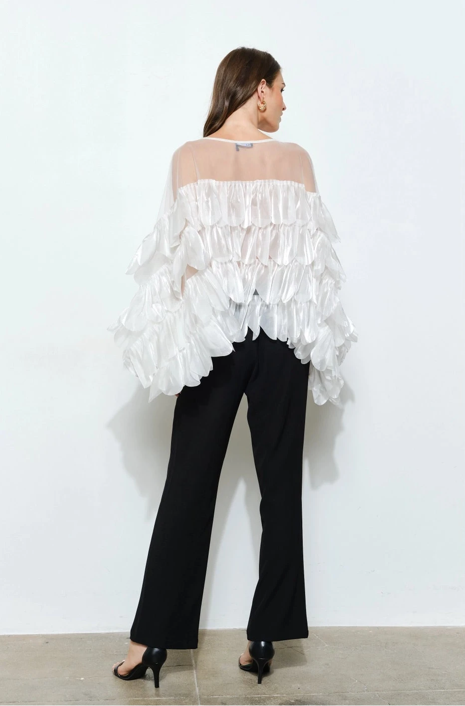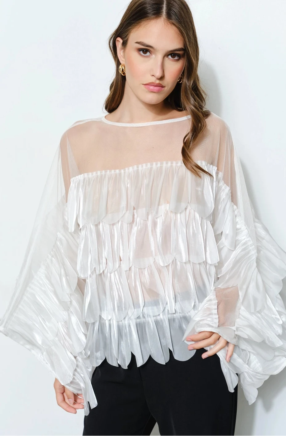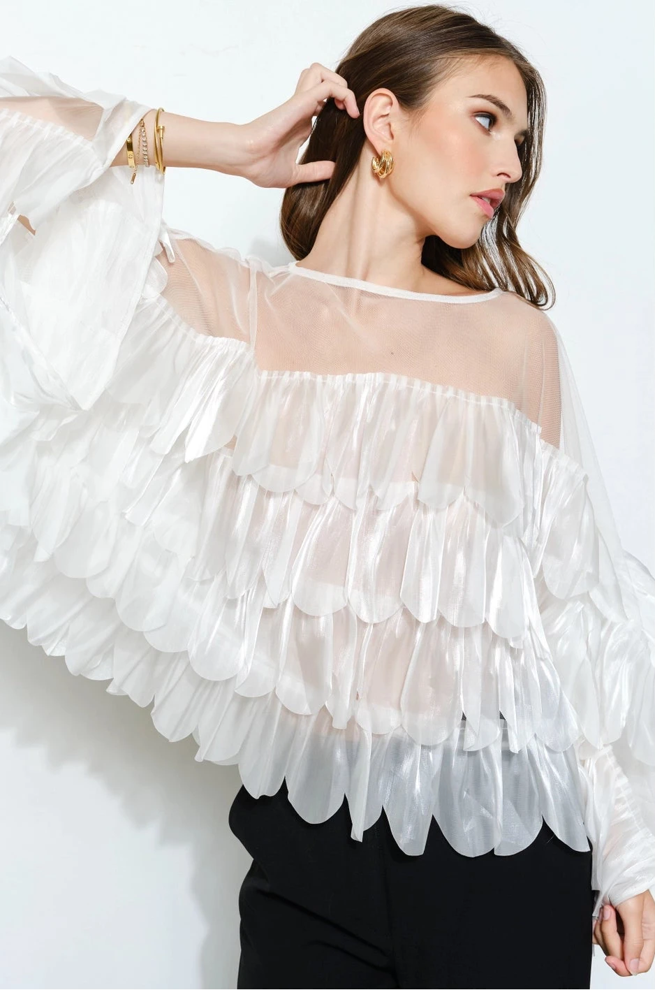 - Shimmering white organza tiered scallop ruffled top