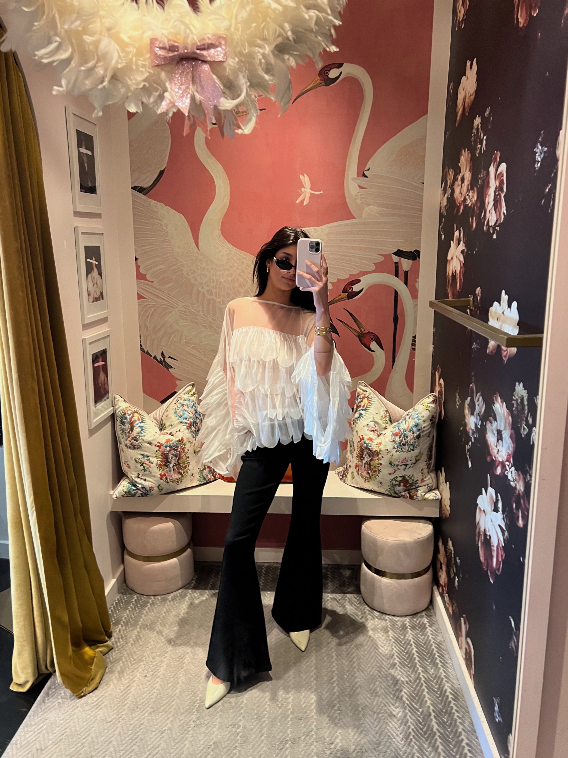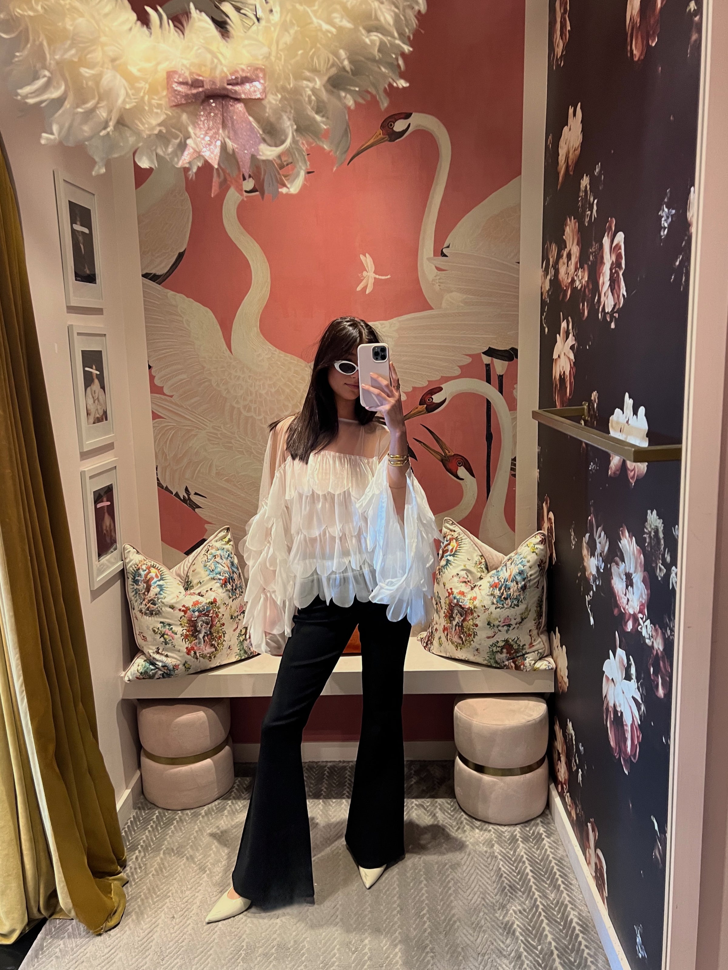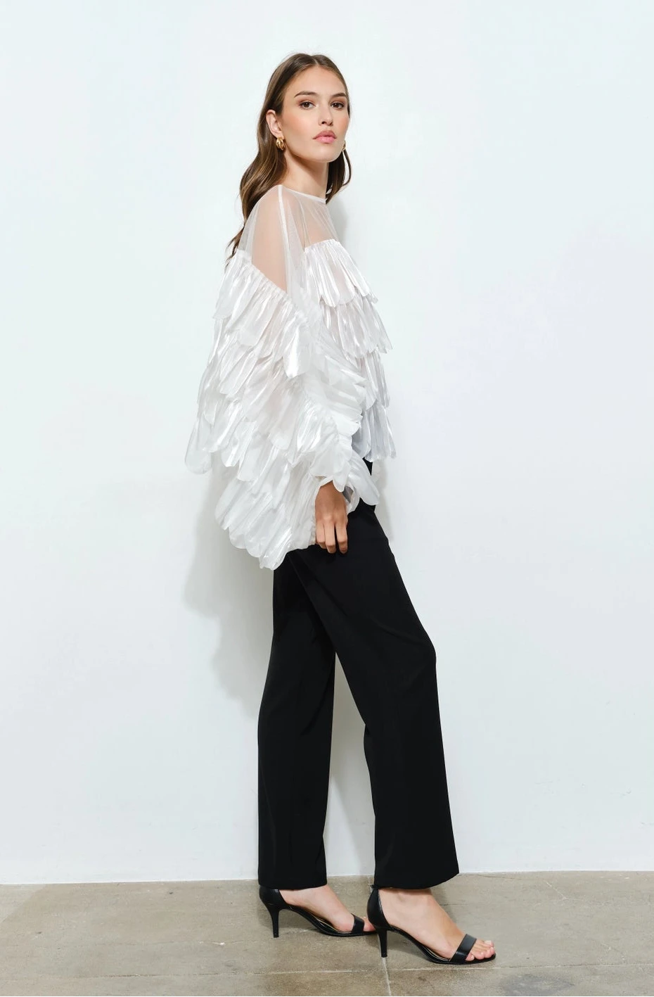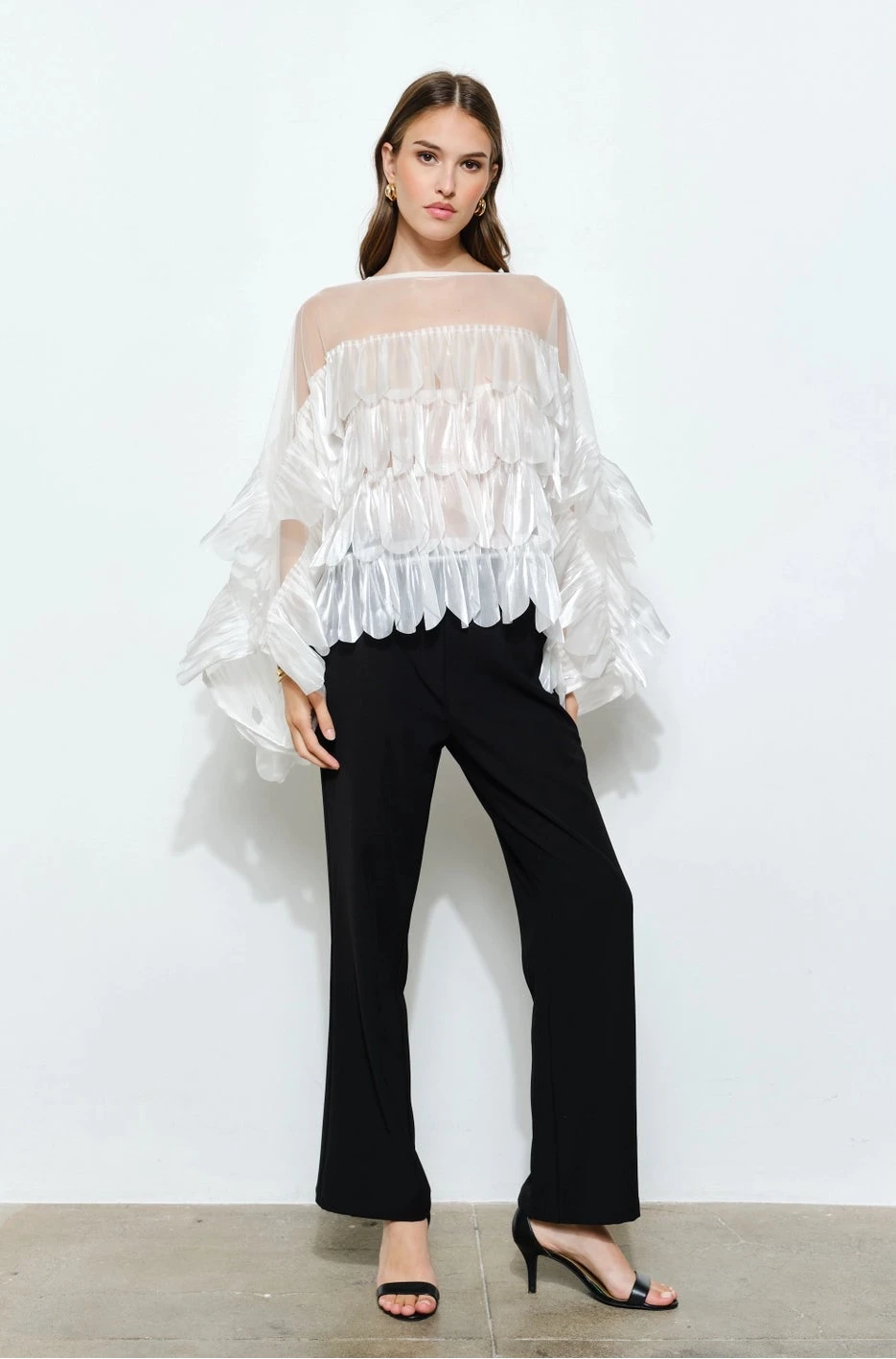 - Shimmering white organza tiered scallop ruffled top