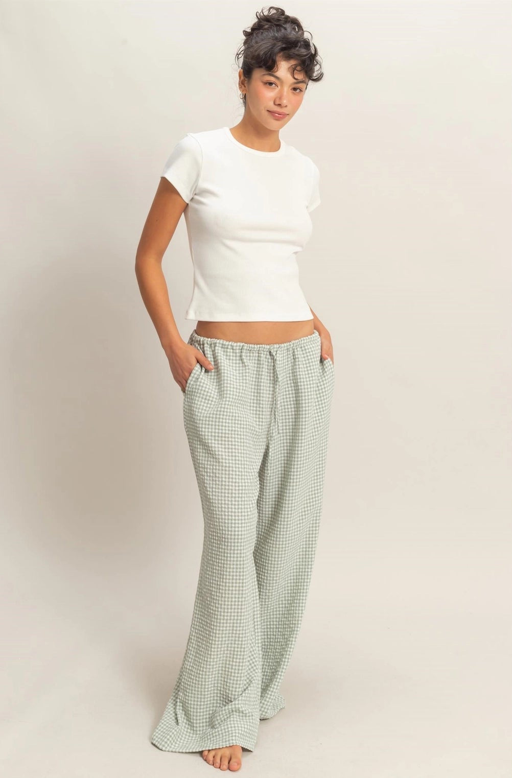 Let's bring it back to the basics and look good doing it. This top has a ribbed construction, shaping a crew neck, short sleeves and a flattering fit to enhance the look of your natural feminine structure.