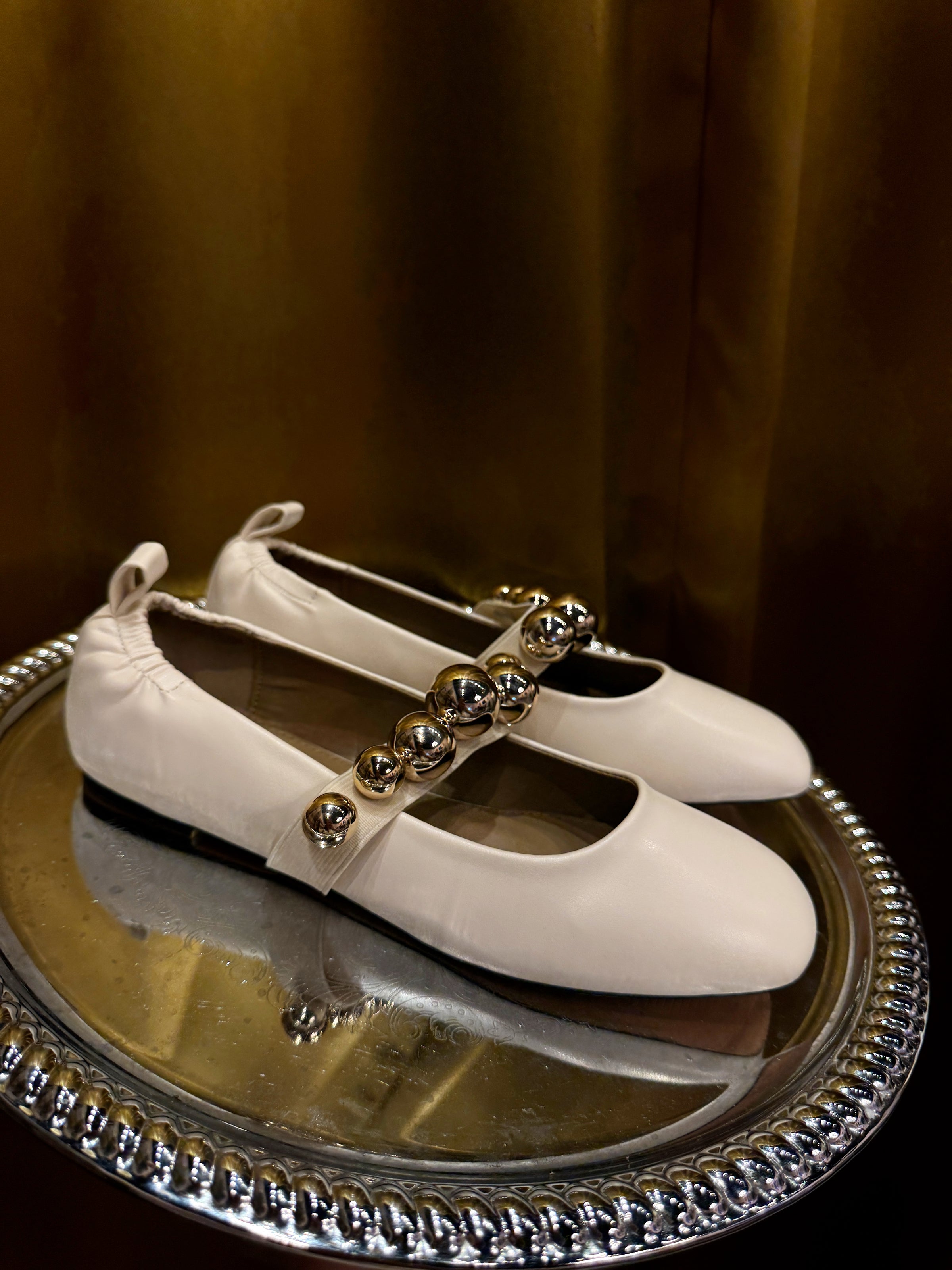 - Designed with a soft, ruched heel and squared toe, this ballet flat reimagines elegance with an oversized gold beaded strap that feels both playful and luxe.