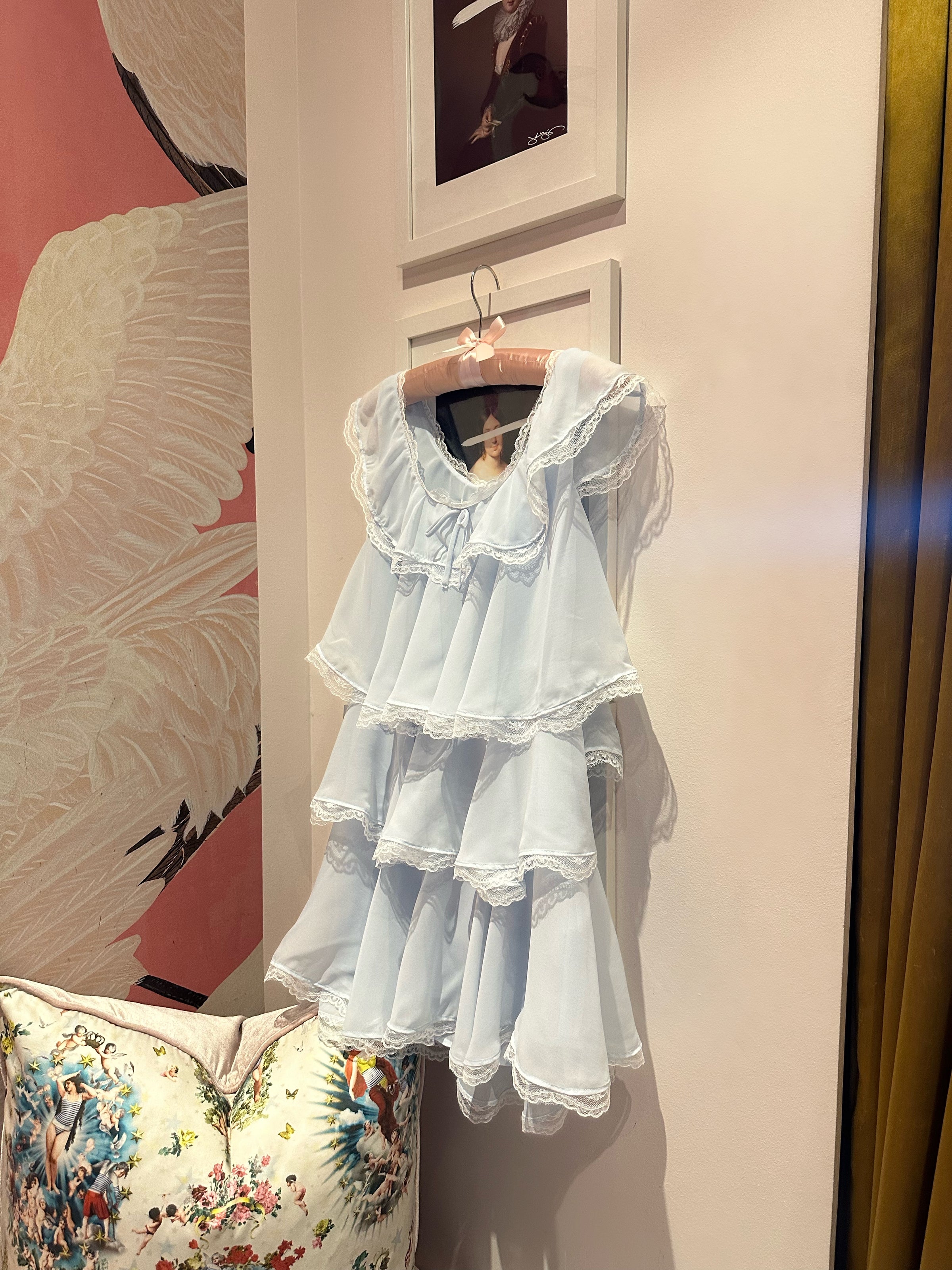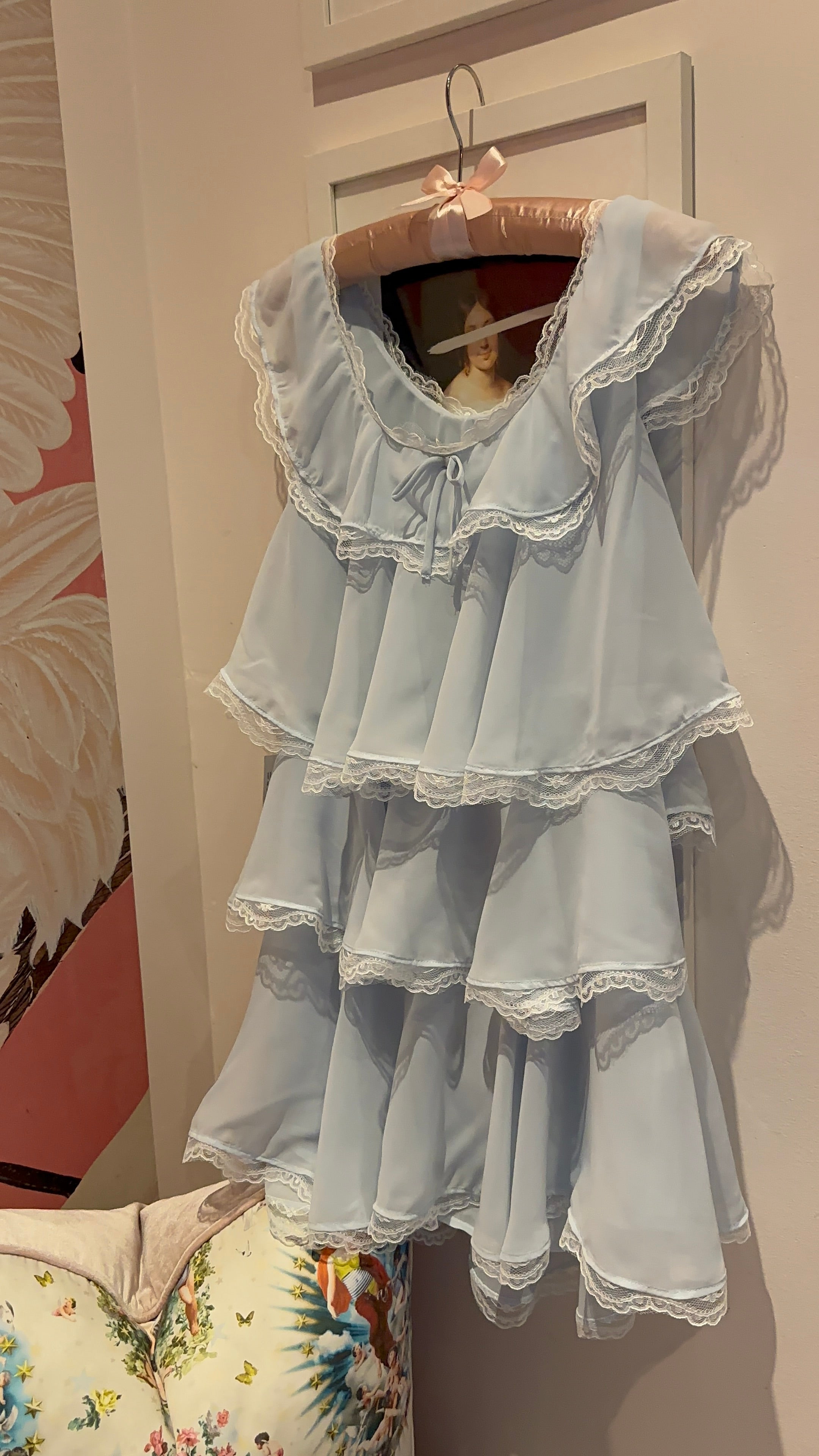 A powder blue chiffon mini dress with tiered ruffles, lace trims, and a scooped neckline give this spring mini dress a flouncy, feminine flourish.